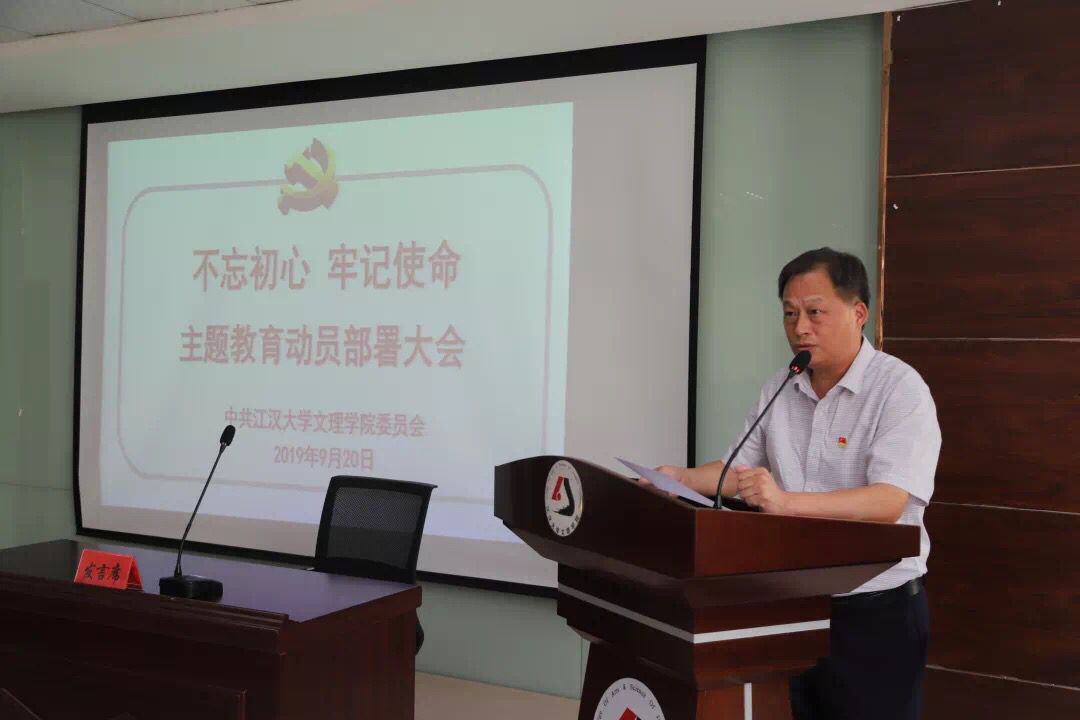 党委委员、副校长万波传达了江汉大学“不忘初心 牢记使命”主题教育动员会议精神。