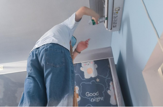 在实操环节,刘老师现场示范了空调滤网拆装、清洗剂使用等专业操作流程。各小组随即展开行动,同学们分工协作、配合默契:有的负责扶稳梯子保障安全,有的专注清洗滤网,有的使用专业清洗剂喷洗内部部件,有的准备清水进行二次冲洗。考虑到宿舍环境卫生,部分同学还主动帮助整理物品、清理地面,确保服务过程不影响同学们的正常生活。