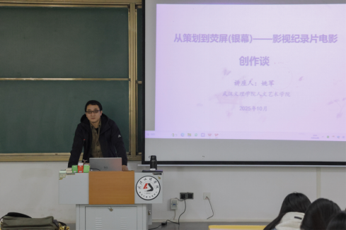 2025年10月29日,湖北广播电视台纪录片部导演、高级记者姚军老师应邀莅临武汉文理学院人文艺术学院,在5号楼123教室为师生们带来题为“从策划到荧屏(银幕)——影视纪录片电影创作谈”的专题讲座。讲座由传播学教研室主任毛蓉老师主持,24级传播学、网络与新媒体、新闻采编与制作专业全体学生参会,现场学习氛围浓厚。