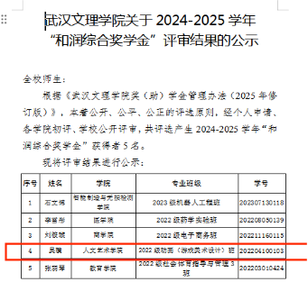 近日,武汉文理学院学生处正式公示2024-2025 学年 “和润综合奖学金” 评审结果,经个人申请、学院初评、学校公开评审等多环节严格筛选,全校仅 5 名学子获此殊荣。其中,人文艺术学院 2022 级动画(游戏美术设计)班学生吴璞凭借卓越的综合素养与突出的实践成果成功入选,成为该院系在此次校级重要奖学金评选中的亮眼代表,充分彰显了人文艺术学院育人工作的扎实成效。