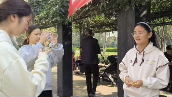 社区居民们也对这些年轻的“记录者”格外亲切,爷爷主动拉着同学们分享菜品背后的故事,热情地邀请大家下次来拍社区的垃圾分类宣传活动、拍小区的银杏道。