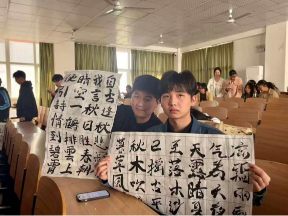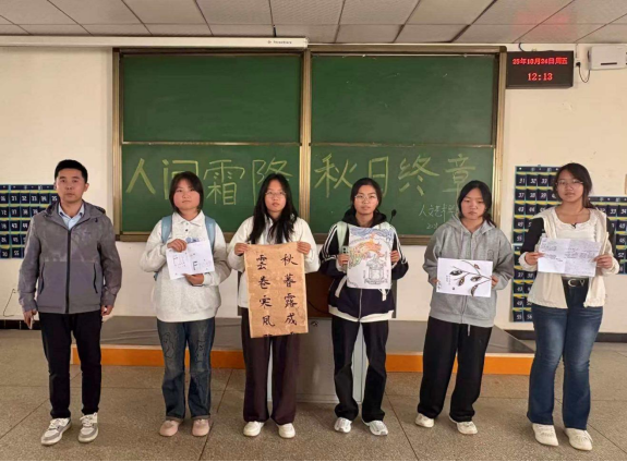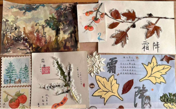 在活动实施过程中,美育的种子在每一个创作细节中生根发芽。参与同学需提前准备并提交以霜降为主题的艺术作品。这一要求激发了同学们的创作热情:有的用水墨勾勒枝头霜色,有的用落叶拼贴深秋画卷,还有的通过手写诗笺抒发季节情怀。这些作品不仅展现了同学们对自然之美的敏锐感知,更体现了他们将情感转化为艺术表达的创造能力。活动现场宛如一个开放的美育工坊,同学们在交流切磋中拓宽了审美视野,在亲手创作中提升了艺术素养。
