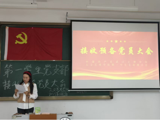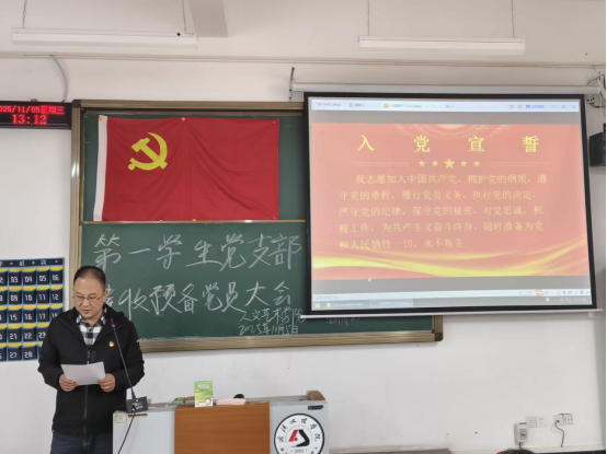 薪火相传,使命在肩。2025年11月5日,武汉文理学院人文艺术学院第一学生党支部召开了一场庄重而充满温情的支部党员大会,议题是讨论接收一批发展对象为中共预备党员。本场大会由人文艺术学院分团委书记谢晓梅主持,这不仅是一次程序严谨的组织生活,更是一场关乎信仰、成长与责任的青春洗礼。